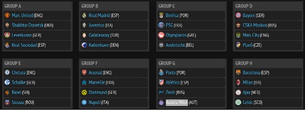 Nhóm 2: Atletico Madrid, Shakhtar Donetsk, AC Milan, Schalke, Marseille, CSKA Moscow, Paris Saint-Germain, Juventus.